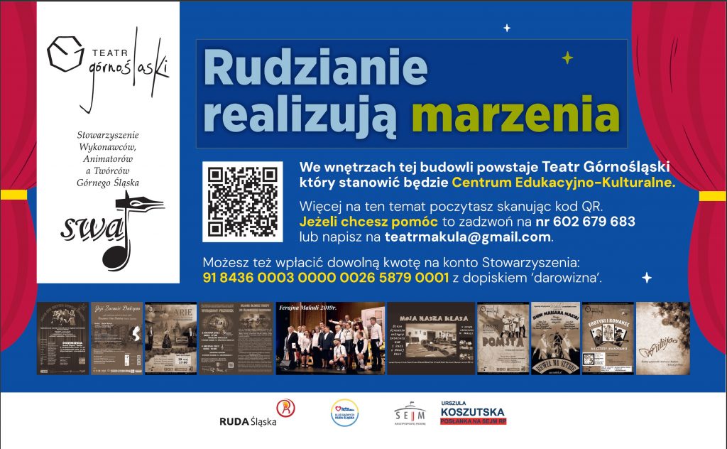 Lokal ma nie tylko być teatrem lecz Centrum Edukacyjno-Kulturalnym dla mieszkańców naszego i ościennych miast Widz będzie otoczony ścianami i sufitem które ozdobią malowidła i murale wykonane przez zaproszonych malarzy amatorów i uczniów rudzkich szkół. Od góry będą umieszczone zrolowane powierzchnie projekcyjne do wyświetlania żywych obrazów tworzących scenografię i klimat dla odbywających się tam zajęć i spektakli. Projektory oraz kamery wraz z oświetleniem i urządzeniami audio sterowane ze stanowisk technicznych pozwolą na bezpośrednie transmisje imprez na portalach internetowych z jednoczesną ich rejestracją digitalizacja i archiwizacją W nasze prace chcemy zaangażować rudzkie szkoły i przeprowadzamy już wstępne rozmowy w celu dalszej owocnej współpracy której celem będą lekcje w otoczeniu żywych obrazów ilustrowane archiwaliami i wykładami fachowców , Liczymy również na górnośląskich przedsiębiorców i jednostki samorządowe Przyjmiemy pomoc i finansową i w formie materiałów budowlanych czy robocizny. Liczymy na śląskie firmy i Ślązaków, na publiczność teatralną której bliska jest idea i formuła Teatru Górnośląskiego Dlatego też prosimy o wpłaty na cegiełki które będą montowane w formie tablic na kolumnach znajdujących się na ścianach wewnętrznych budynku . Każda osoba indywidualna która wpłaci 2000 zł + koszt wykonania wybranej tablicy otrzyma bezpłatny wstęp na 12 imprez organizowanych przez Teatr. Zamiast pieniędzy można zaoferować również pracę jako wolontariusz na rzecz Teatru którą wycenimy według obowiązujących stawek Potrzebujemy na dziś: malarzy , tynkarzy , murarzy , sprzątaczek a także pracowników którzy uprzątną gruz w piwnicy pod sceną Dla firm które wpłacą po 5 000 zł oprócz cegiełek oferujemy przez najbliższe 2 lata wyświetlanie spotów z ich logo i reklamą przed spektaklami .Zamiast wkładu finansowego firma może zaoferować pomoc w robociźnie czy materiałach jak farby, tynki kleje płyty itp. itd. Jeżeli chcecie wpłacić jakąkolwiek darowiznę która posunie roboty do przodu podajemy konto 91 8436 0003 0000 0026 5879 0001